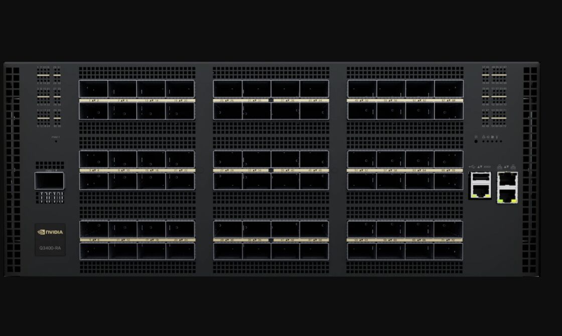 The NVIDIA Quantum-X800 Q3400-RA/Q3401-RD 4U switches, the first to leverage 200Gb/s-per-lane serializer/deserializer (SerDes) technology, significantly enhance network performance and bandwidth. They feature 144 ports at 800Gb/s distributed across 72 octal small form-factor pluggable (OSFP) cages. The switches’ high radix supports a two-level, fat-tree topology capable of connecting up to 10,368 network interface cards (NICs) with minimal latency and optimal job locality, as well as other topologies providing connectivity to tens of thousands of GPUs.